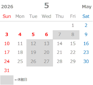 通常、毎週火・水曜日は休館日ですが、5月は5日(火)、6日(水)が国民の休日にあたりますので特別に開館いたします。その代わりに5月7日(木)、8日(金)を振替休館日とさせていただきます。ご見学の予定を立てられる際は、上記日程にご注意ください。